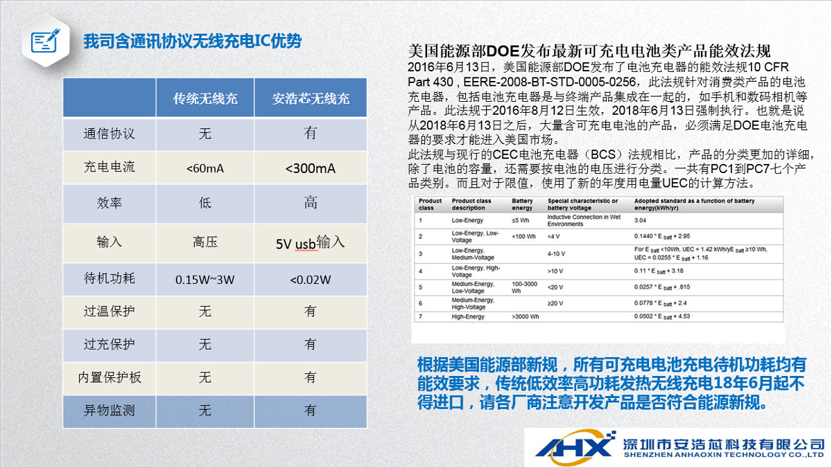 我司無線充電IC方案具有體高、成本優勢明顯、應用電路簡單等特點,發射和接收IC集成度高,帶有通訊協議,具有異物識別、過充保護、過放保護、短路保護等功能。
